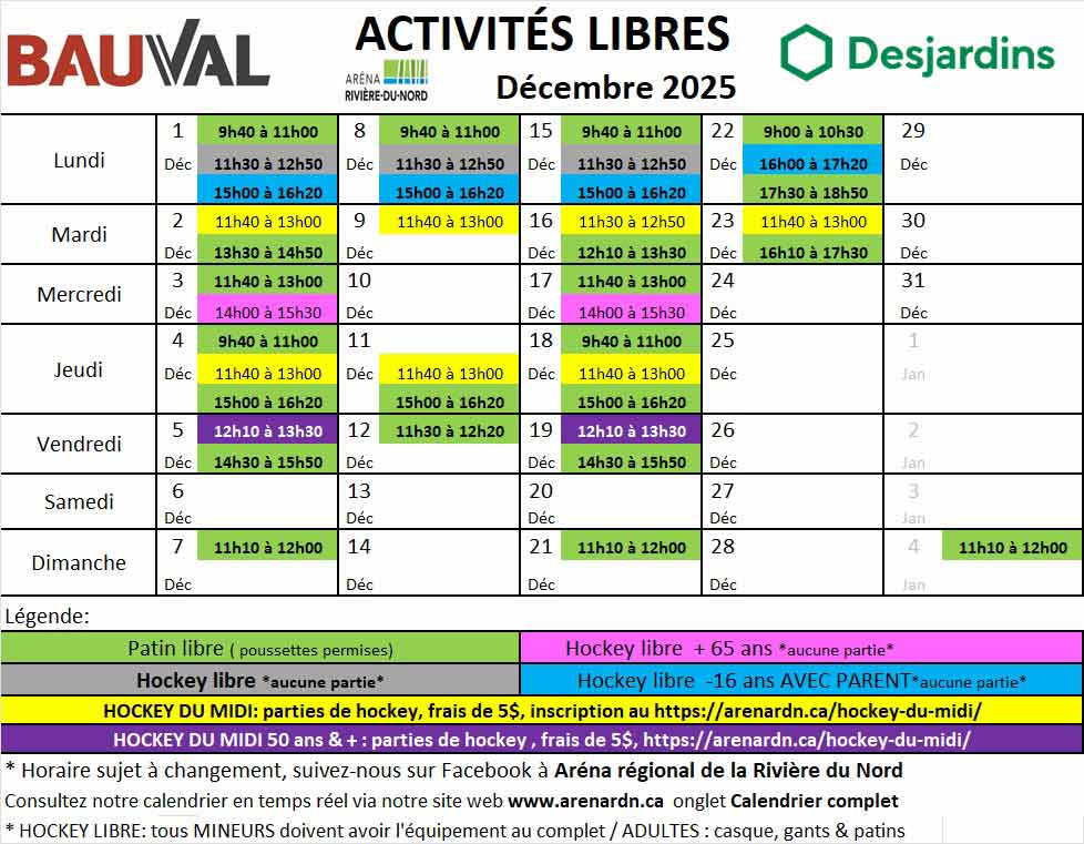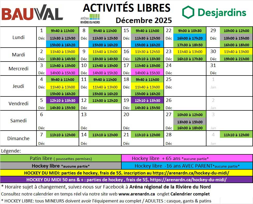 Horaire du patin et hockey libre